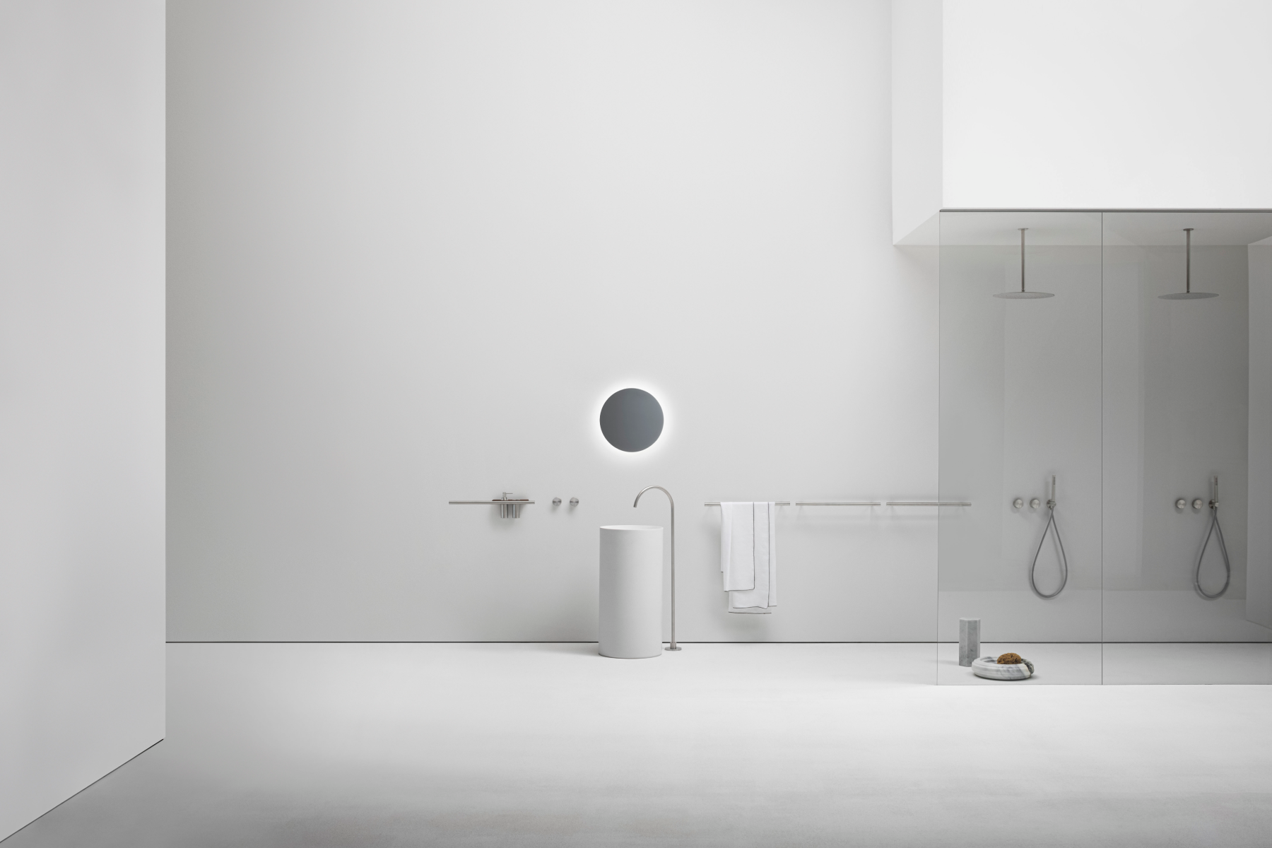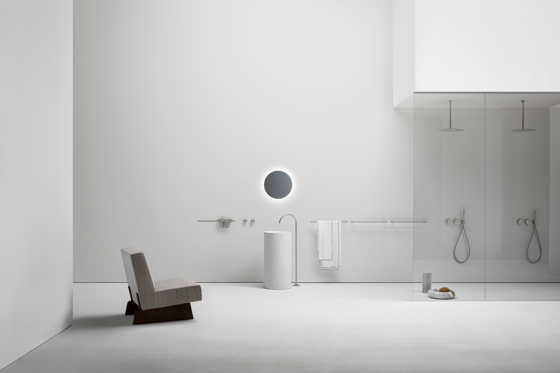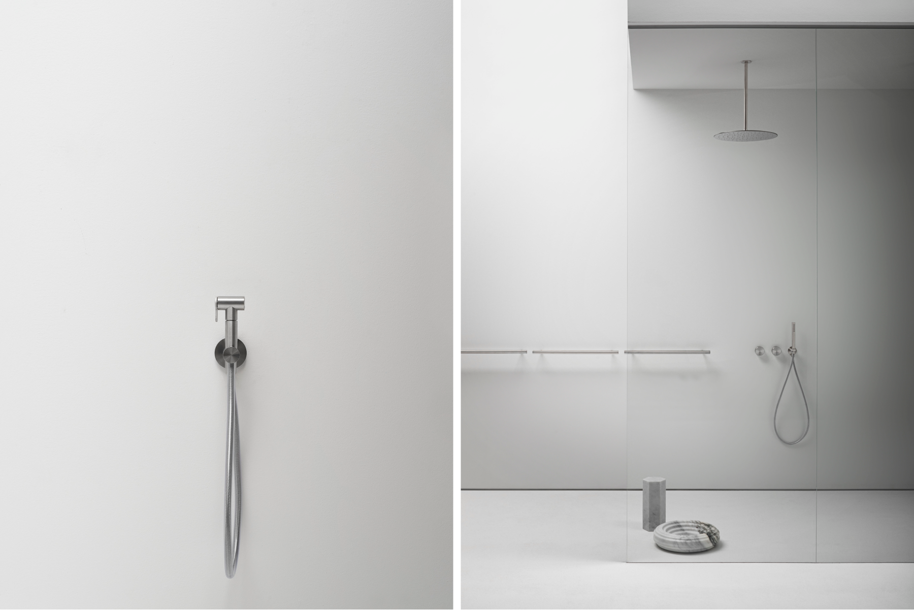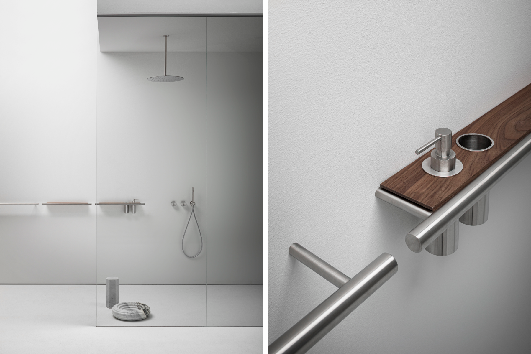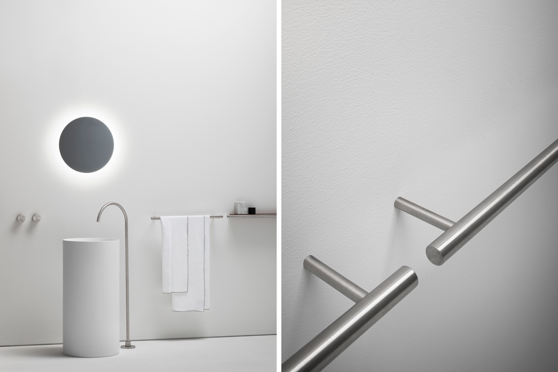 Un’unica collezione per diverse funzioni, pensata per rispondere a molteplici esigenze: porta salviette da parete con o senza accessori, porta salviette free standing, porta scopino da parete e da terra, scopino idrogetto da parete, porta rotoli carta da terra. I differenti elementi possono essere scelti singolarmente oppure accostati tra loro a creare geometrie metalliche nette e minimali.