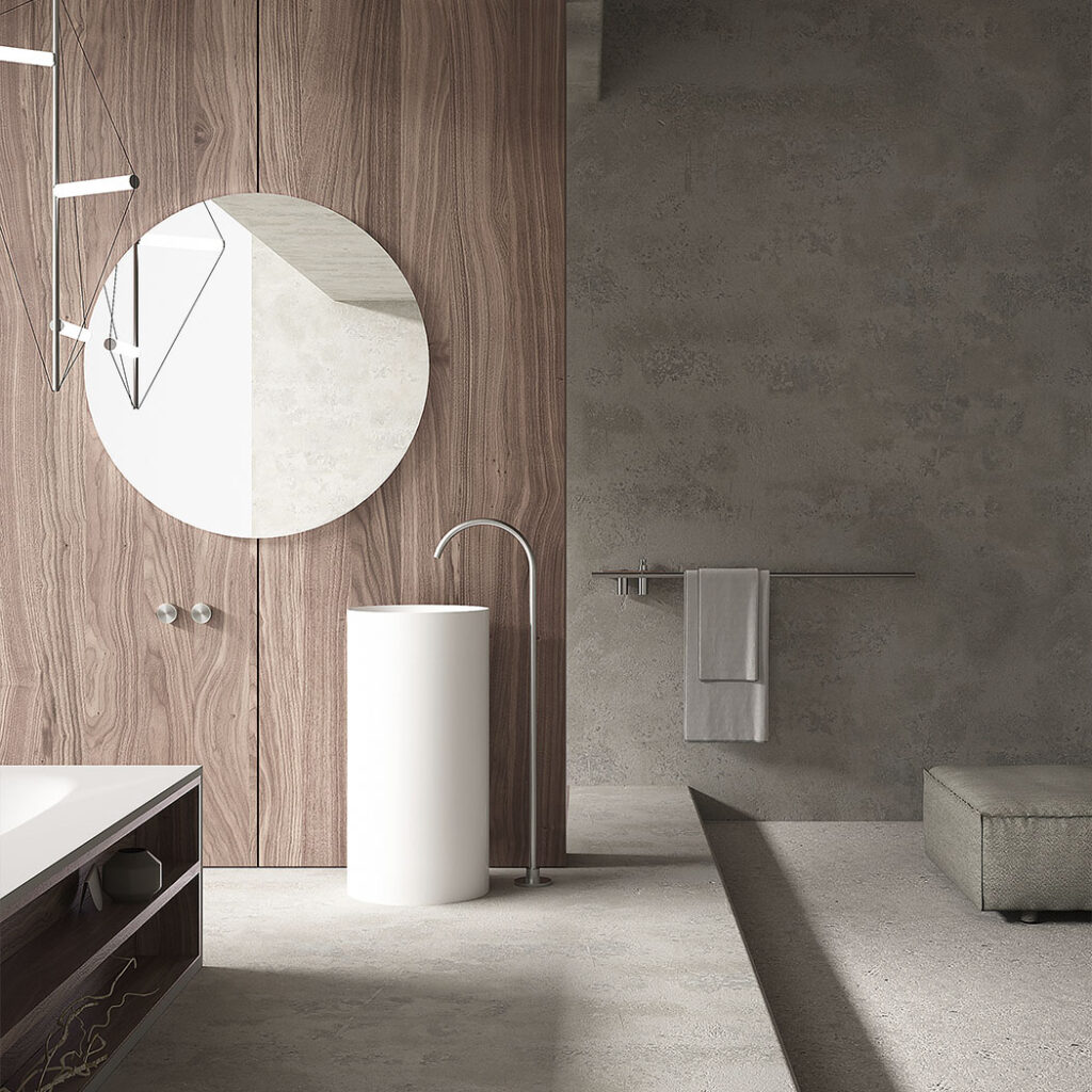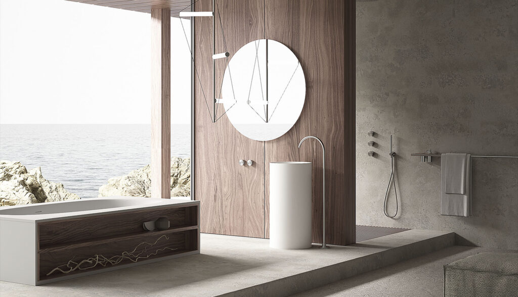 Si possono trarre ispirazioni di bagni da sogno da suggestioni di case, posizionando la vasca da bagno vicino alla vetrata, per godere la vista delle meraviglie naturali del Mediterraneo. I colori neutri si ispirano alla roccia arenaria di colore sabbia, che si accorda con il bianco candido del lavabo. Il bagno si trasforma in un’opera d’arte con il lavabo Fontana, la cui forma cilindrica conferisce forza e purezza. Realizzato in Cristalplant Biobased antibatterico, il lavabo Fontana è resistente e sostenibile.