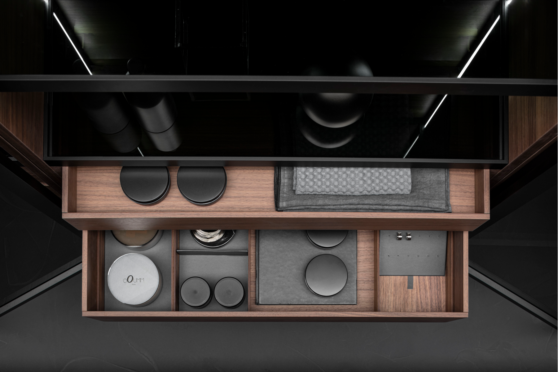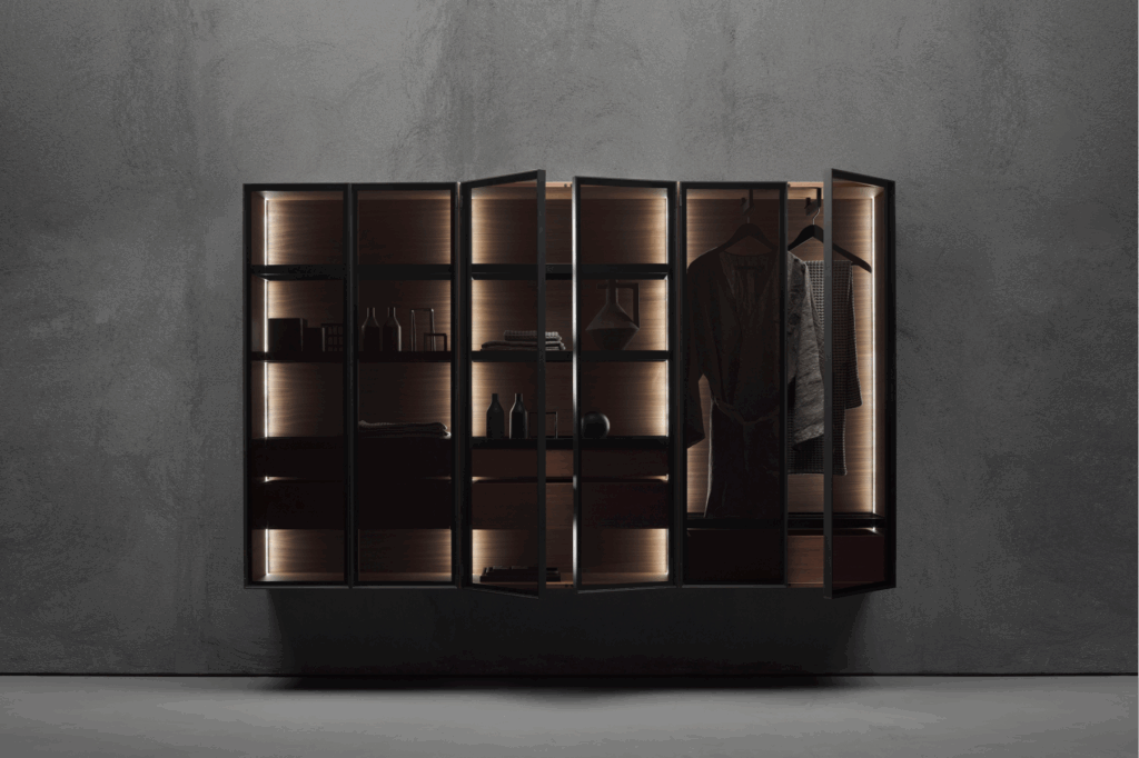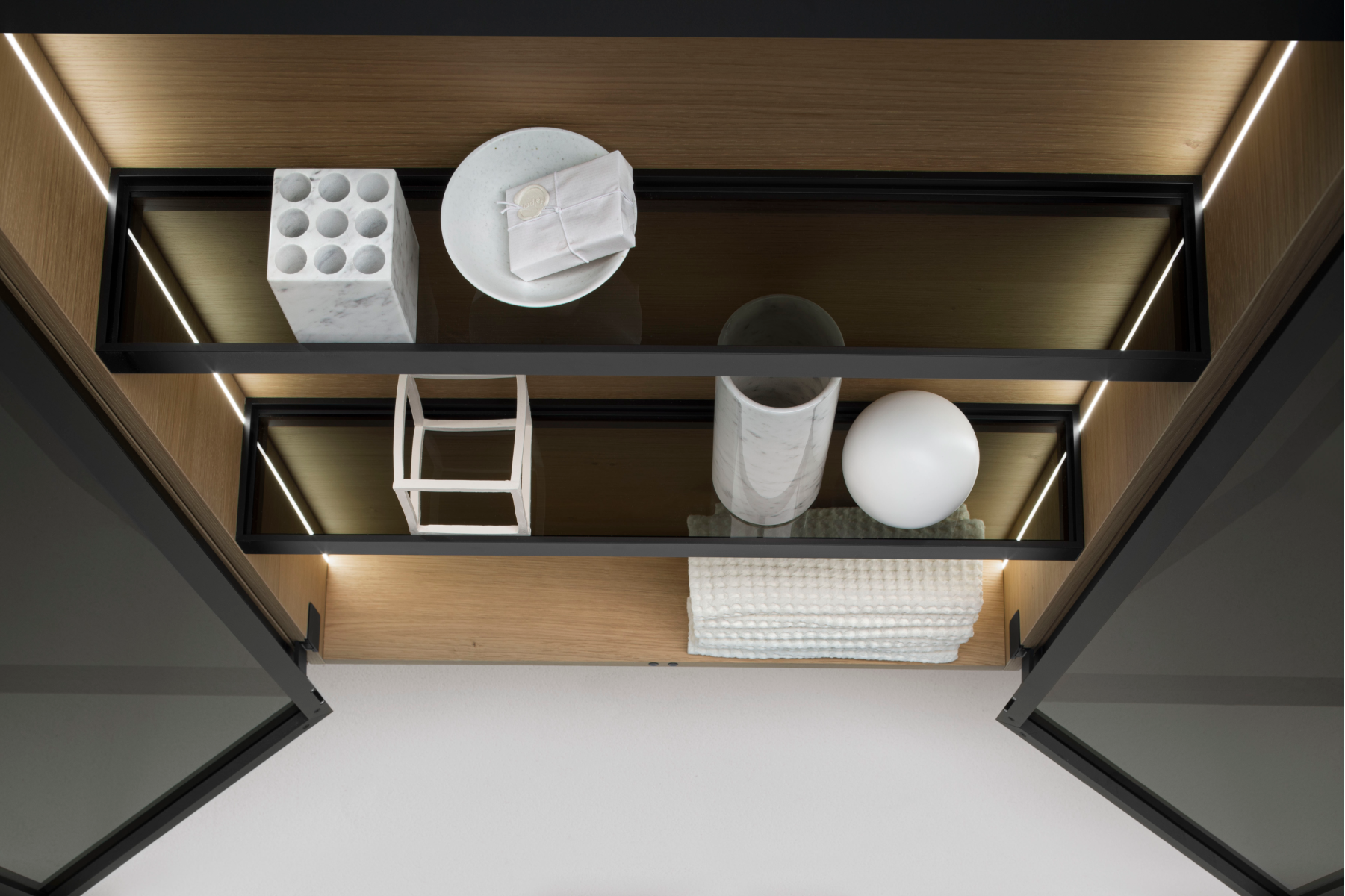 This system can be configured in various compositions and sizes, and is available in two depths — 20 and 35 cm. It can be enriched with numerous high-end options and accessories, such as integrated LED lighting (also ideal as courtesy light) and drawer accessories.