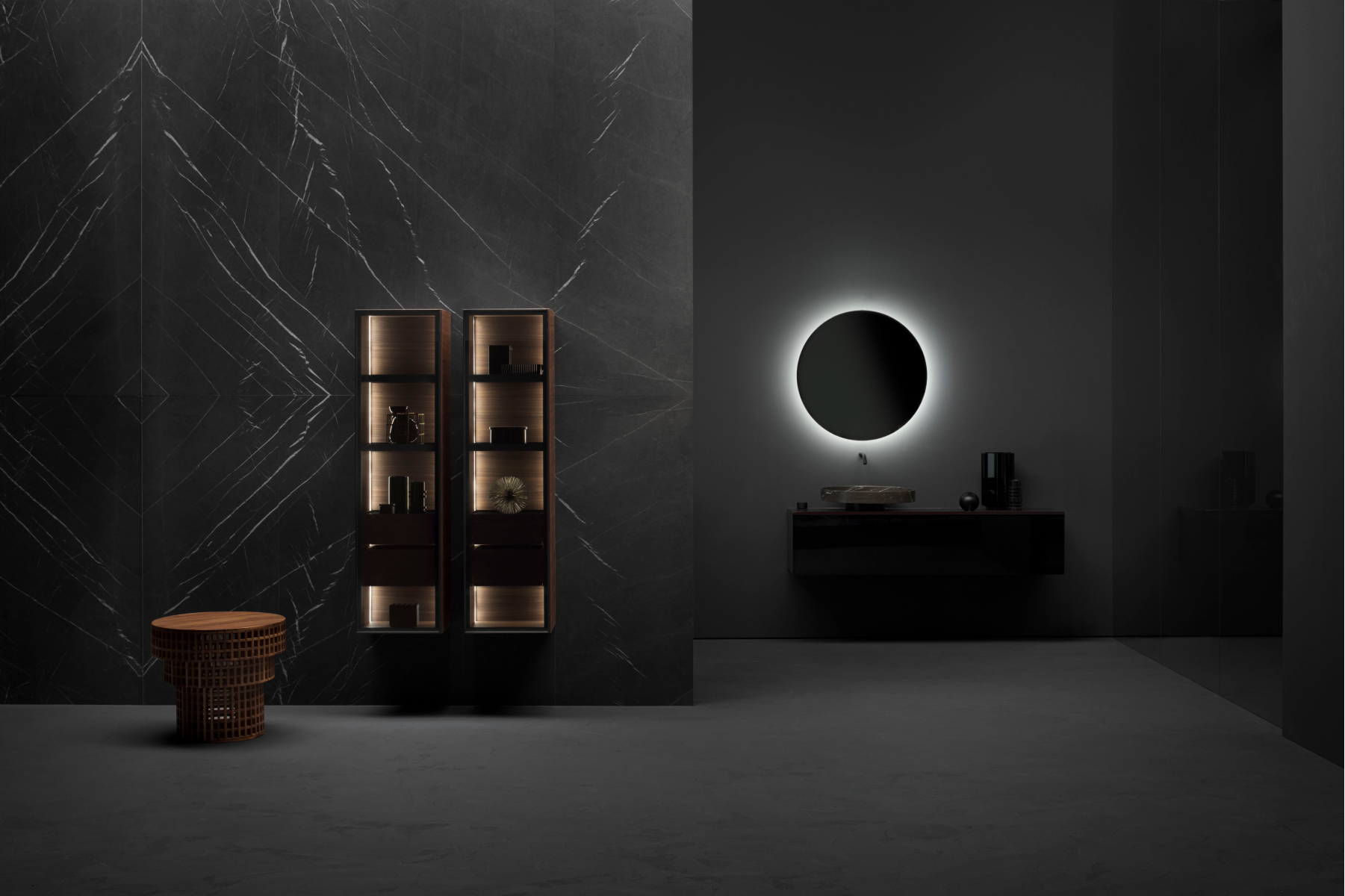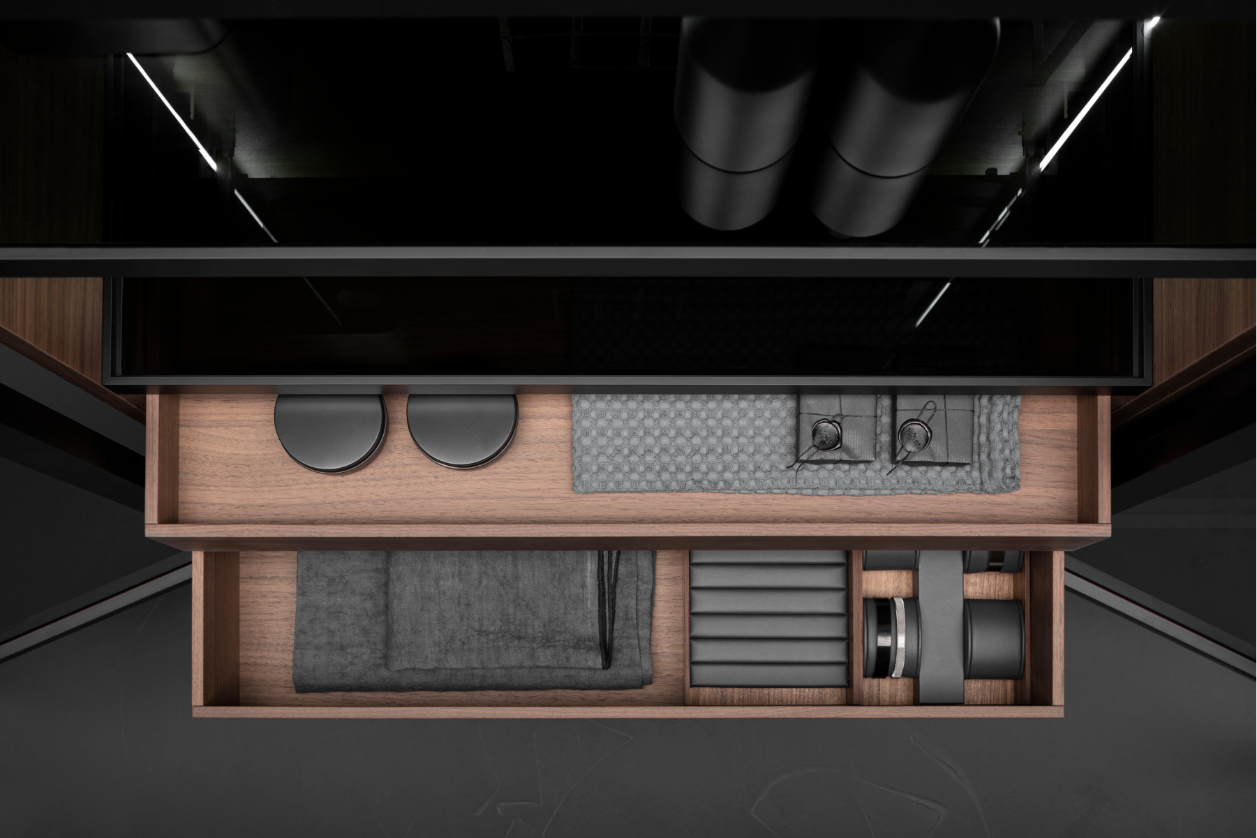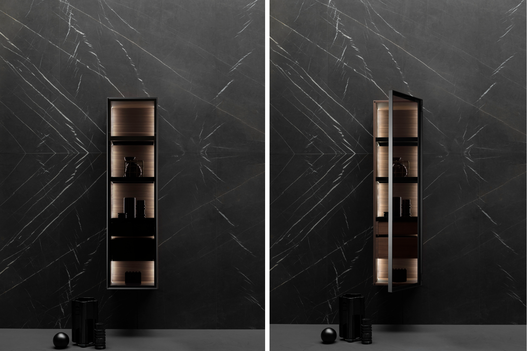 This system can be configured in various compositions and sizes, and is available in two depths — 20 and 35 cm. It can be enriched with numerous high-end options and accessories, such as integrated LED lighting (also ideal as courtesy light) and drawer accessories.