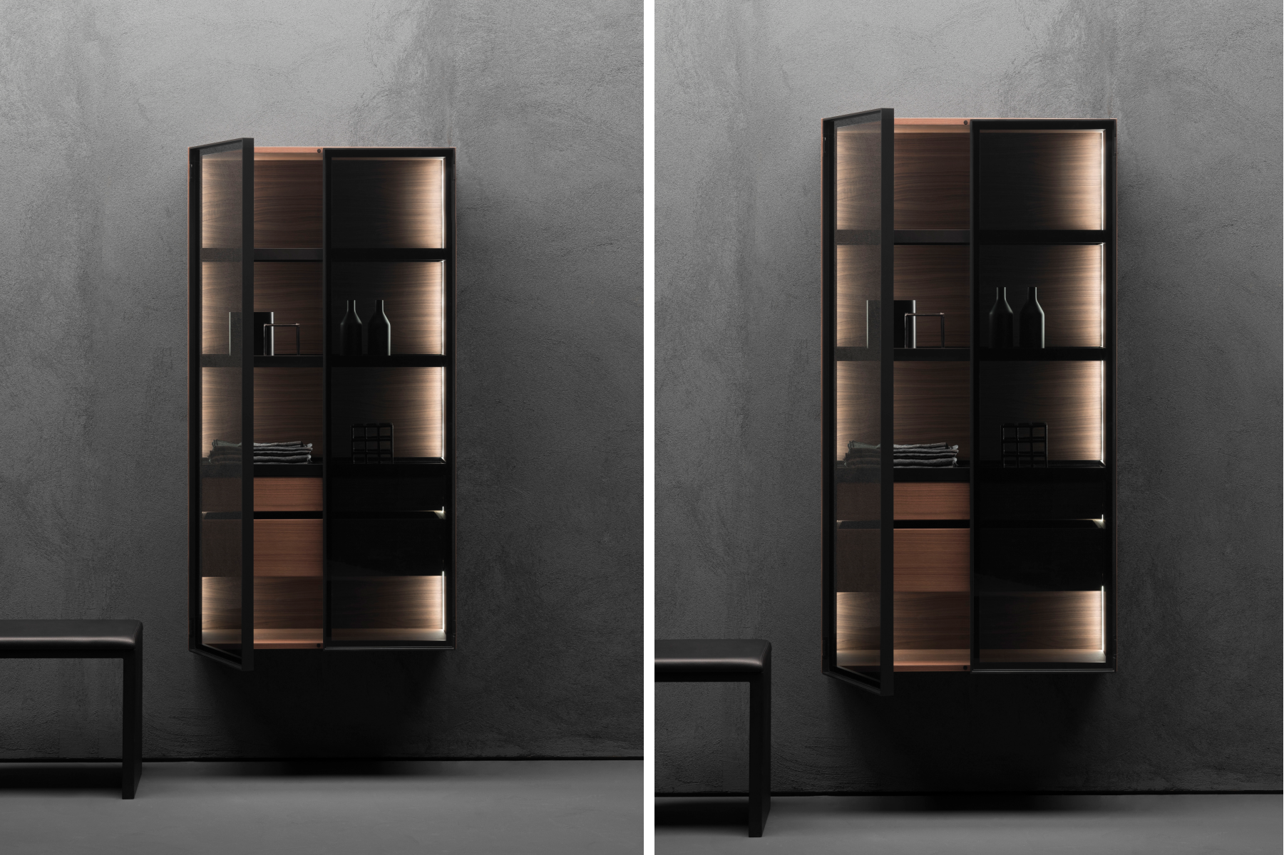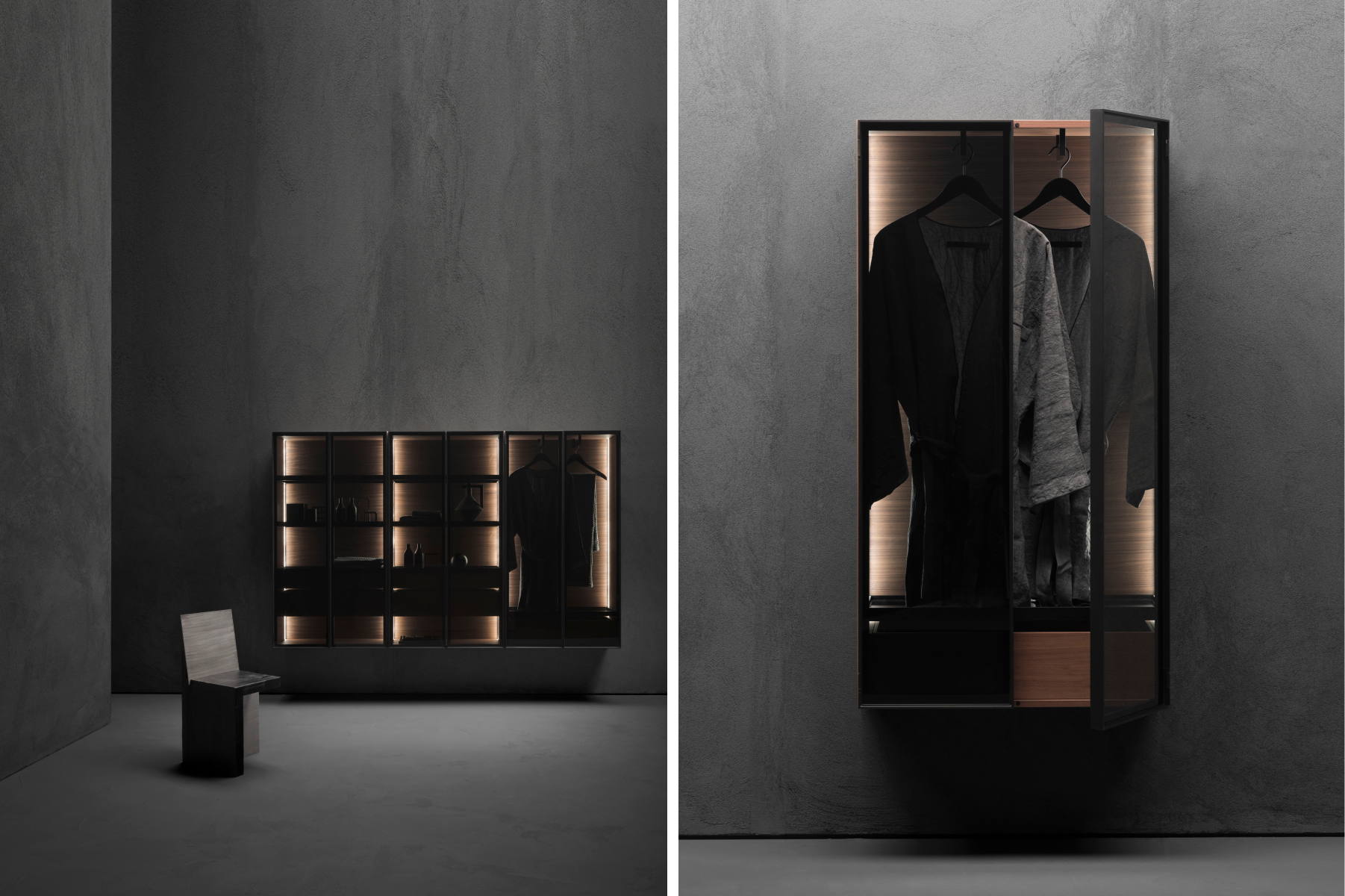The Butler wall-mounted storage collection, designed by Andrea Federici, features modular tall units that can be configured with shelves, internal drawers, and clothes racks.