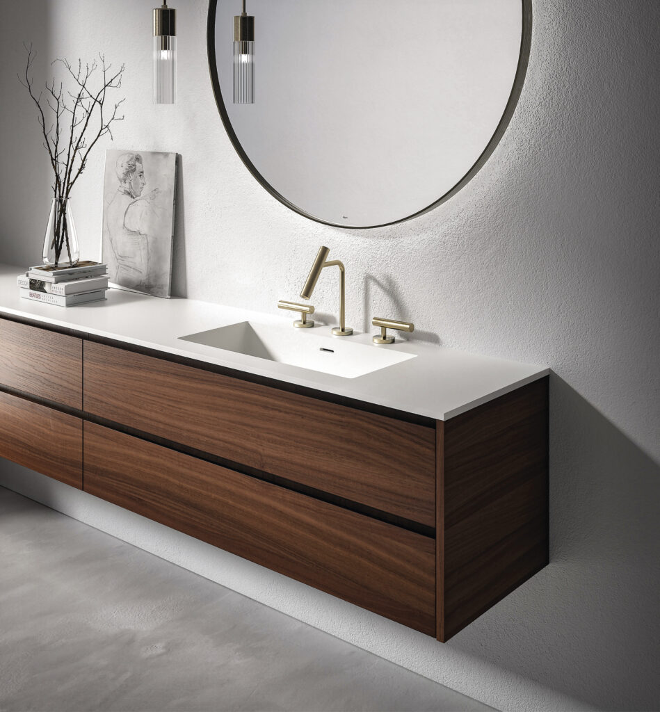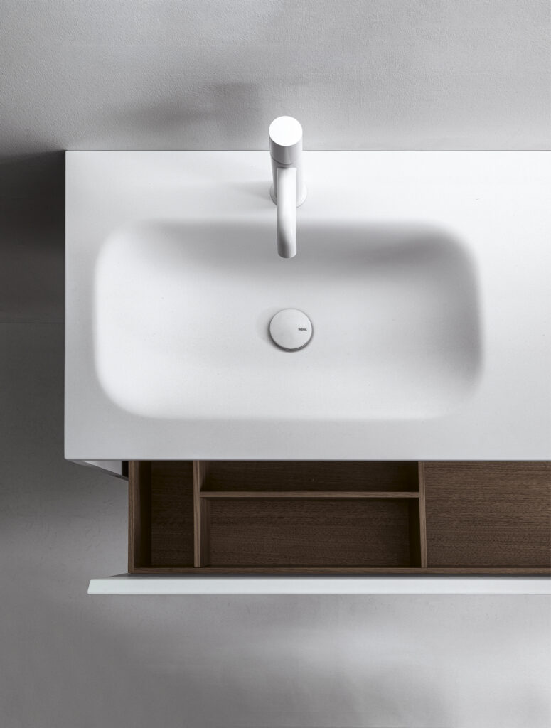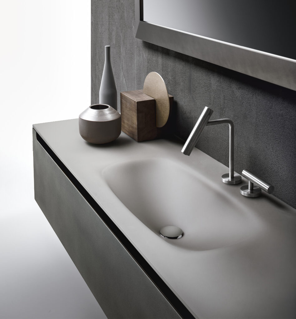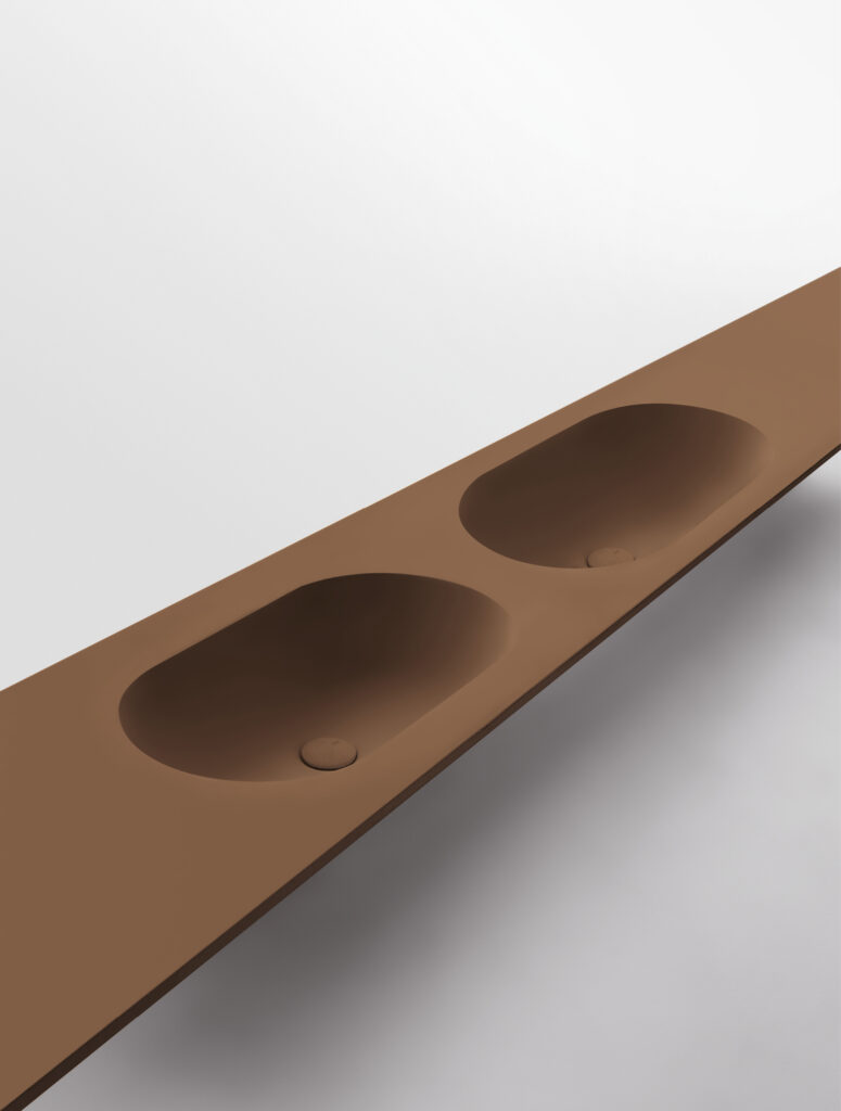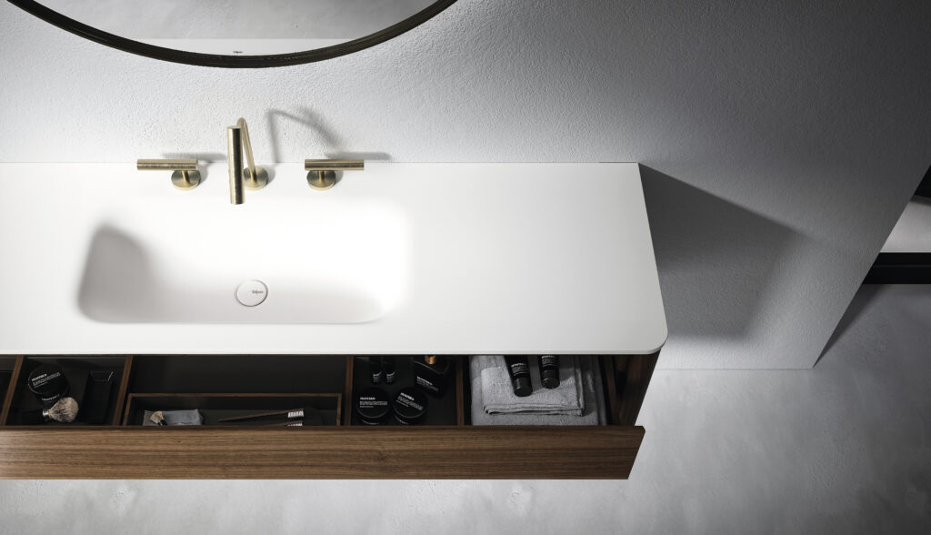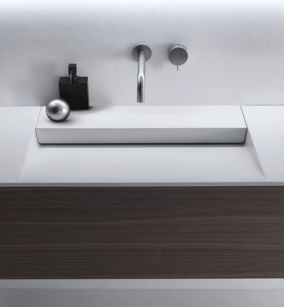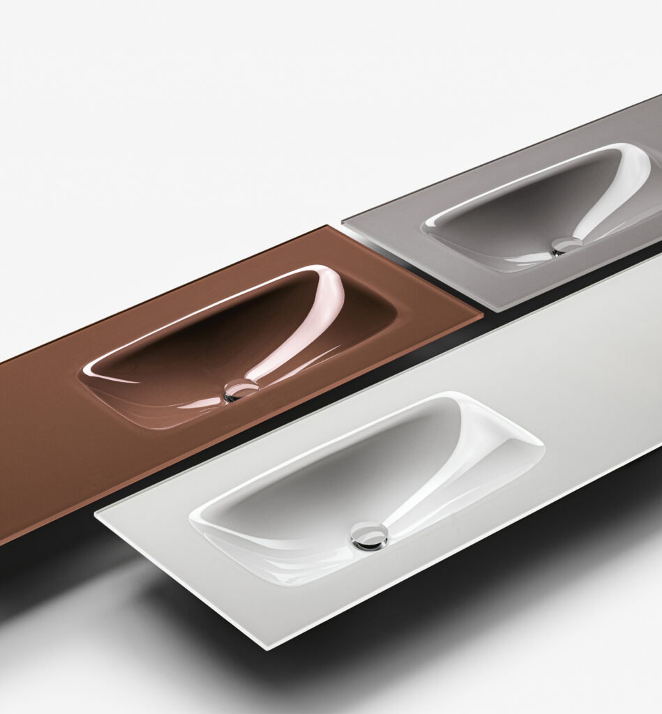 Our integrated countertops are made of glossy or satin lacquered glass, Ceramilux, and Cristalplant Bio Active with plant-based resins, and can be produced in endless sizes and configurations — either countertop-mounted or directly wall-mounted.