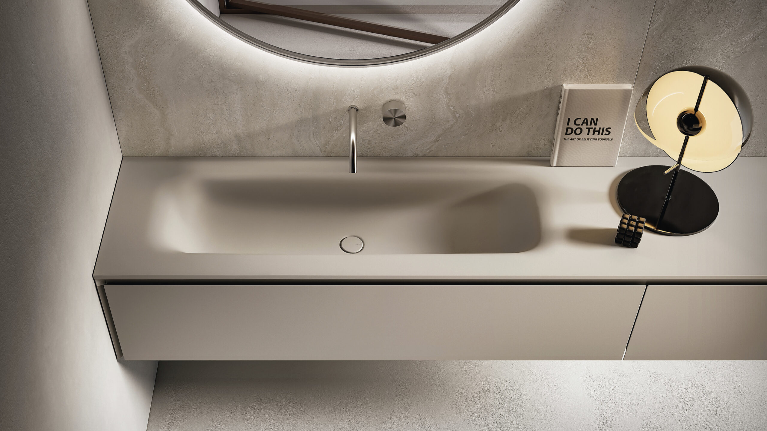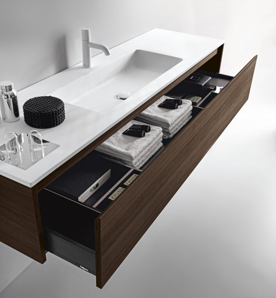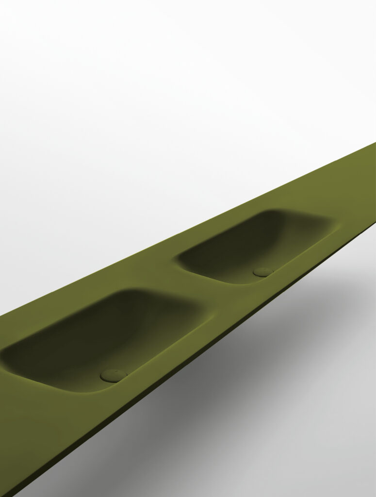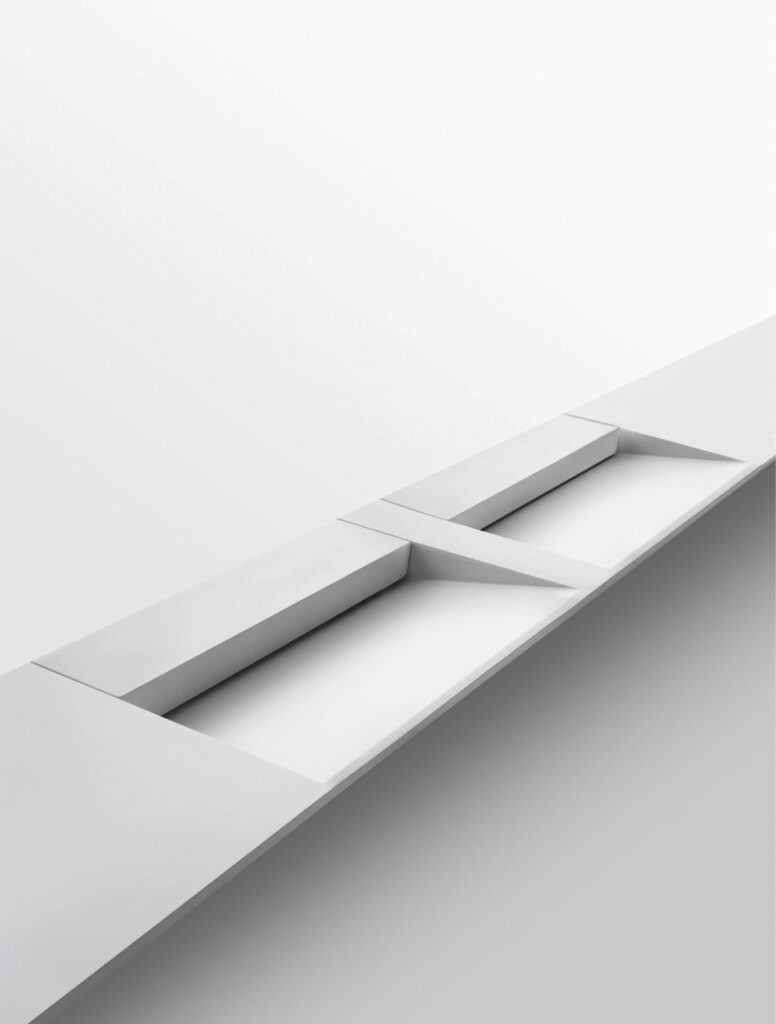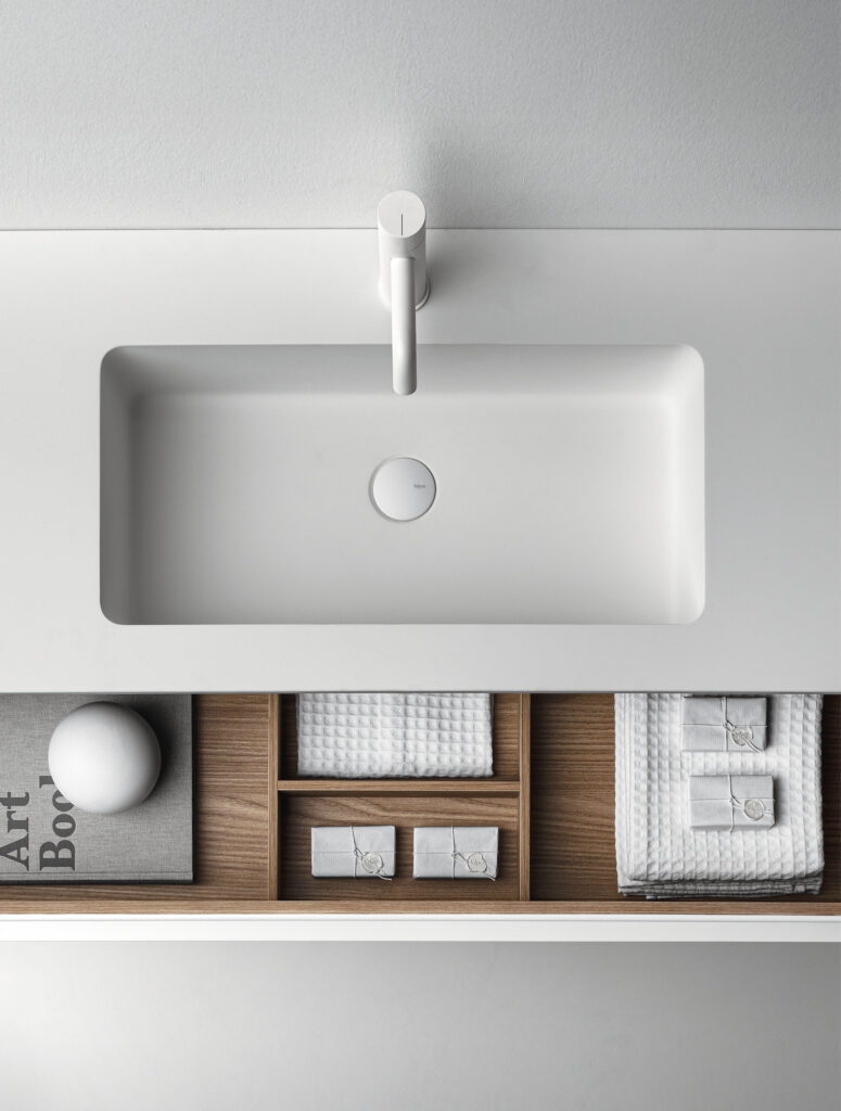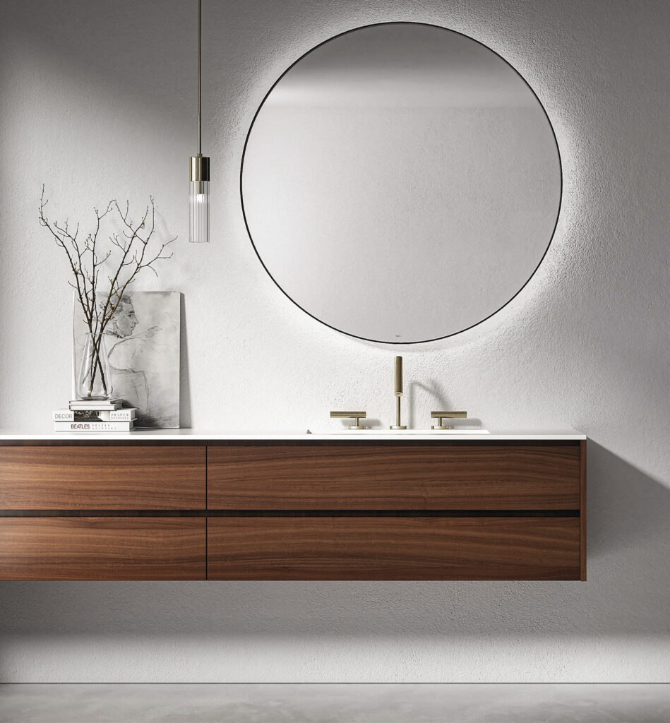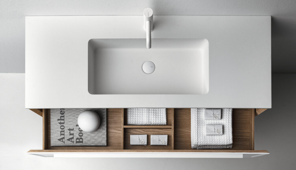 Our integrated countertops are made of glossy or satin lacquered glass, Ceramilux, and Cristalplant Bio Active with plant-based resins, and can be produced in endless sizes and configurations — either countertop-mounted or directly wall-mounted.