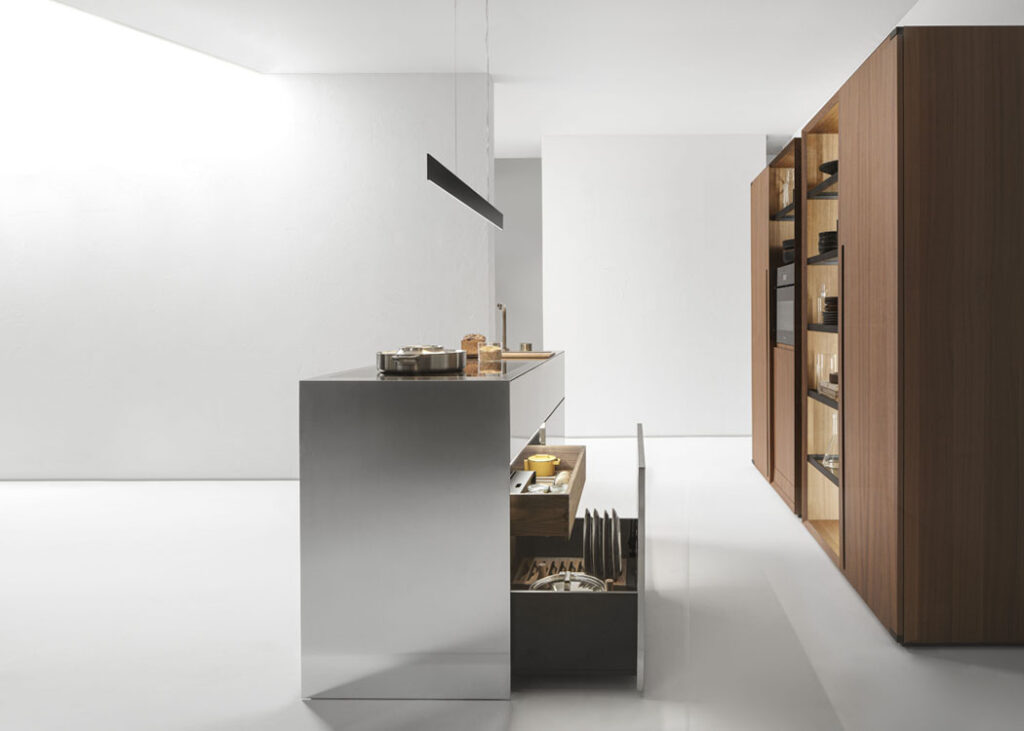 The defining element is the mini Islands available in three standard sizes of 120/150/180 cm, which can be entirely conceived in different marble finishes, with walnut drawers or in stainless steel. Combined with sideboards that house appliances and storage compartments, this year the kitchens are enriched with tables that emerge from the sides of the Islands like natural appendages and snack counters that seem suspended in space, like great wings, thanks to a stainless steel bracket system concealed within their thickness. Among the innovations at Via Pontaccio 10, the kitchen Island is also presented in the wall-mounted solution.