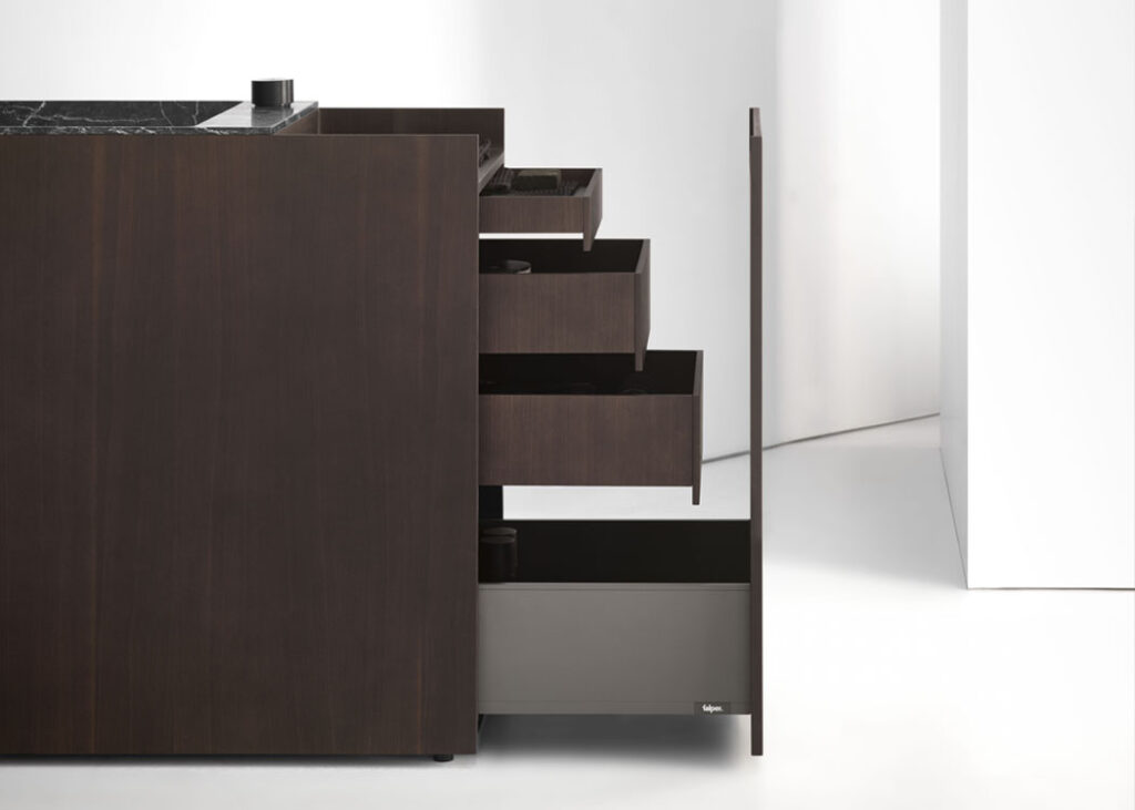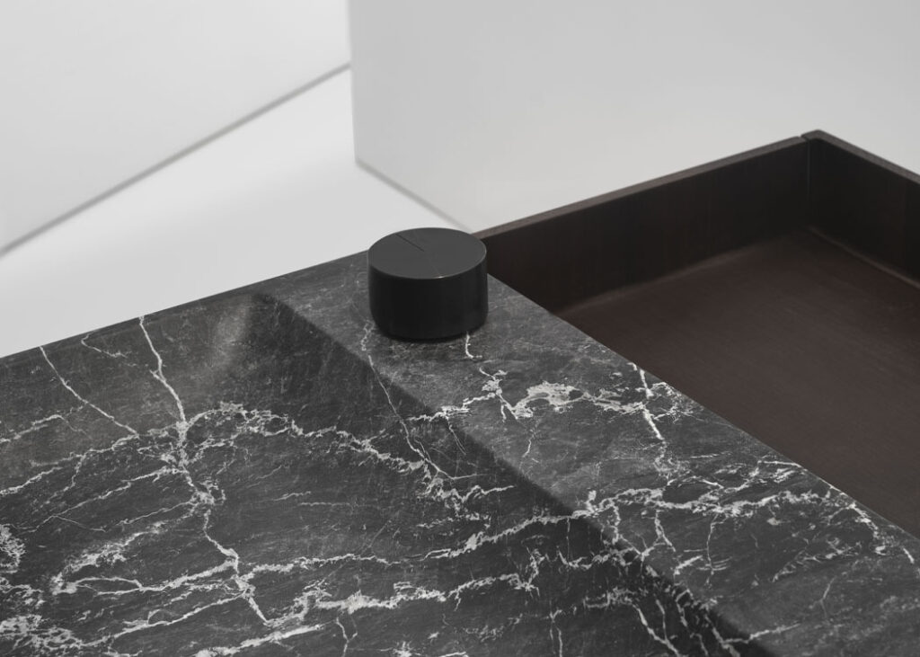 The solid wood drawers draw on artisanal craftsmanship with cabinetmaking details, expressing a soul of innovative design. The drawers refer to a practical idea of organisation, whose internal space can be arranged according to personal preferences. The drawers can be mounted on the front or sides and the internal configuration can be planned and customised to measure. The washbasins in marble or Cristalplant® Bio Active express sophisticated essentiality in their form.