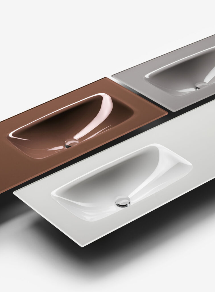 Glass tops and glass tops with integrated basin are made from extra-clear safety glass, using thermoforming, stress-relief and cold painting processes with water-based paints. Satin glass tops are treated with etching and surface formatting with nanotechnological paints that are stain-resistant and anti-fingerprint.