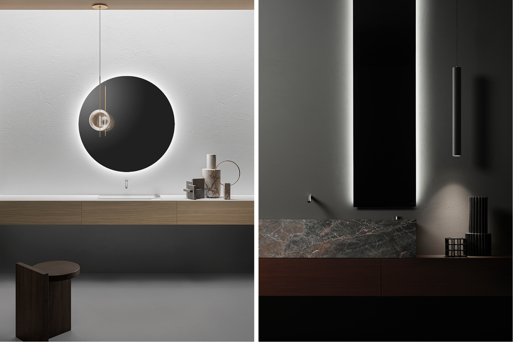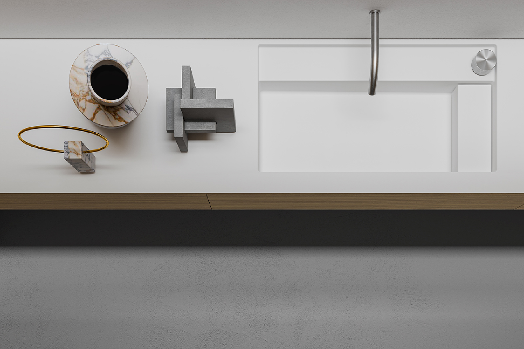 The integrated countertop basin version is available in marble or in Cristalplant® Bio Active, in white or in the brand’s new colour palette.