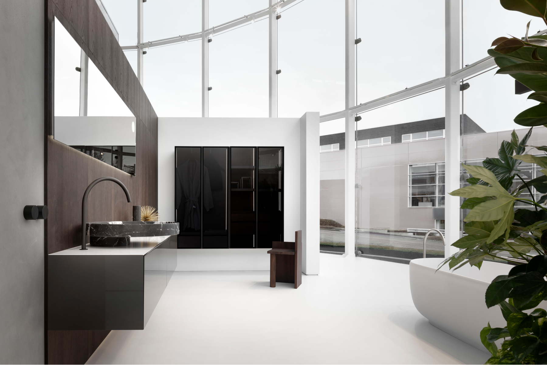 The products selected for the display include Falper’s latest collections — such as the Minimum range of furniture and washbasins, the Cilindro accessories and new tap holders, all designed by Victor Vasilev, along with the Butler storage units and wardrobes by Andrea Federici.