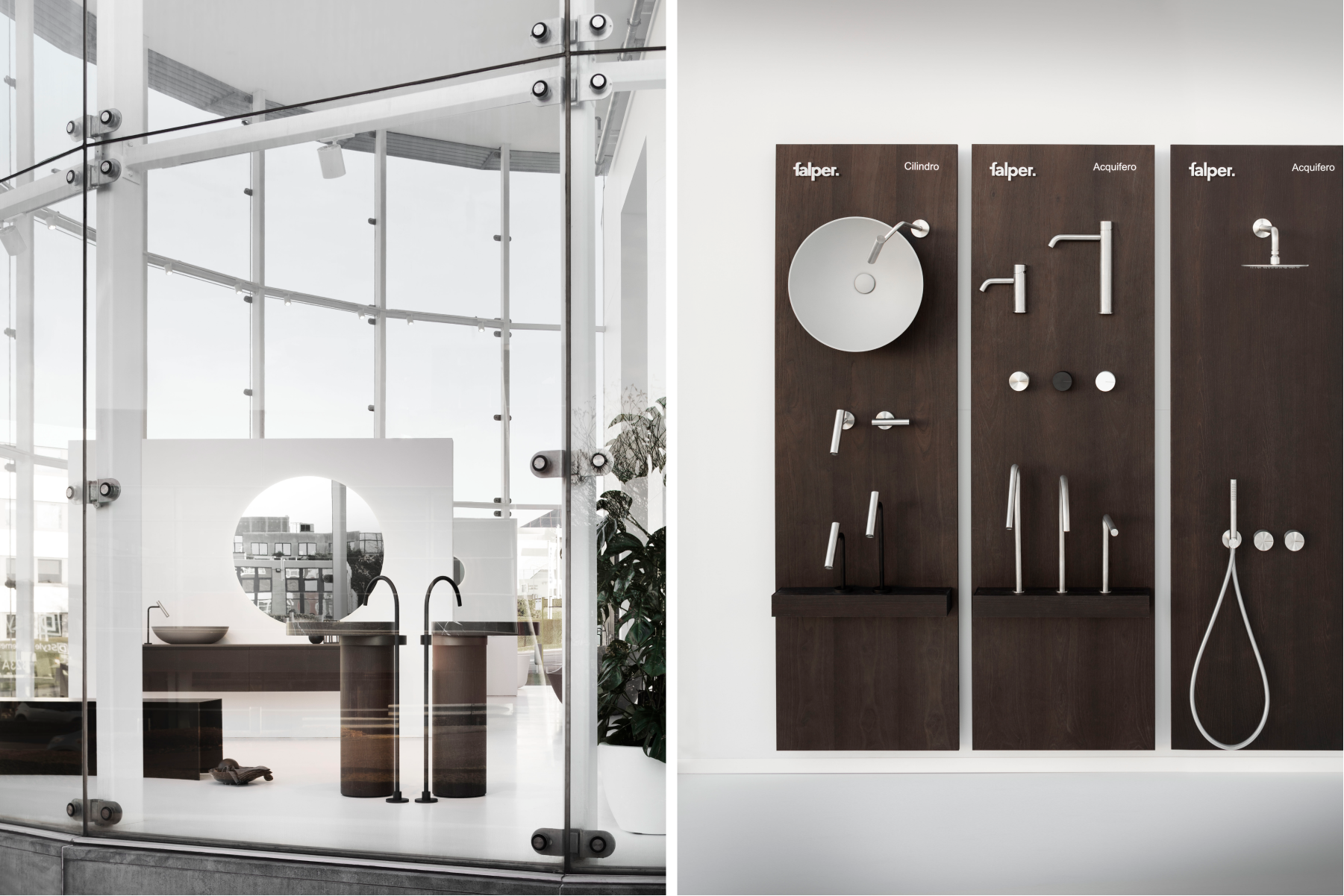 The setup also features some of Falper’s most iconic and best-selling collections, including Eccentrico, Pure, Fontana, and 4.0 by Metrica, as well as a selection of pieces by young designers, such as the Lancetta bathtub by Lucia Carlomagno and the Homeycollection by Simone Bonanni & Attila Veress.Lancetta