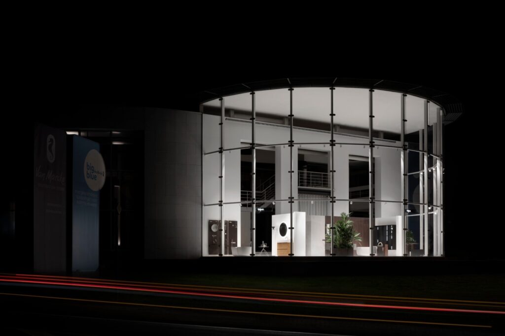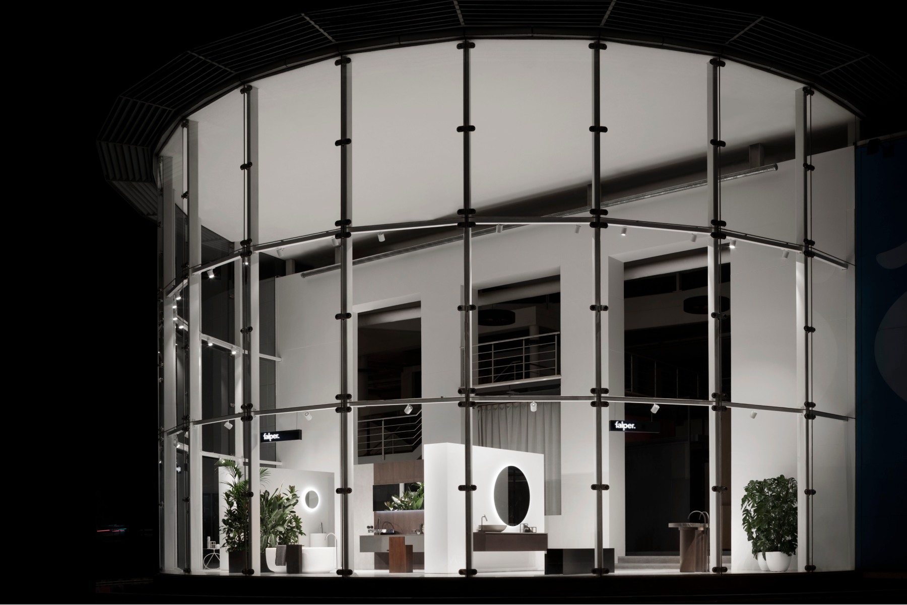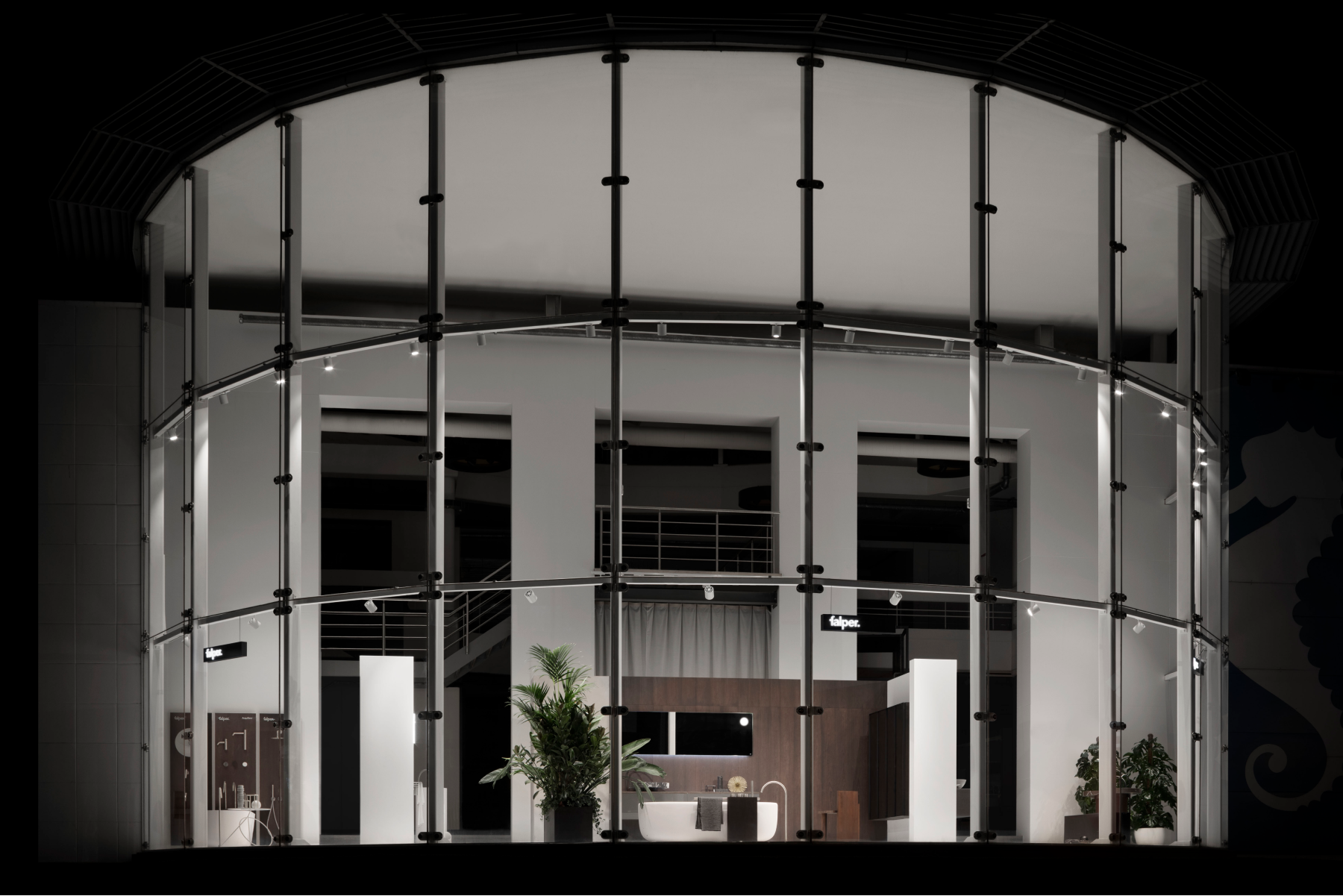 The 100-square-metre Falper area fully occupies the impressive window display of Van Marcke’s Brussels showroom. Designed by Falper’s Style Department, the installation is conceived to reflect the brand’s aesthetic identity while responding to the specific characteristics of the space, market, and partner needs.