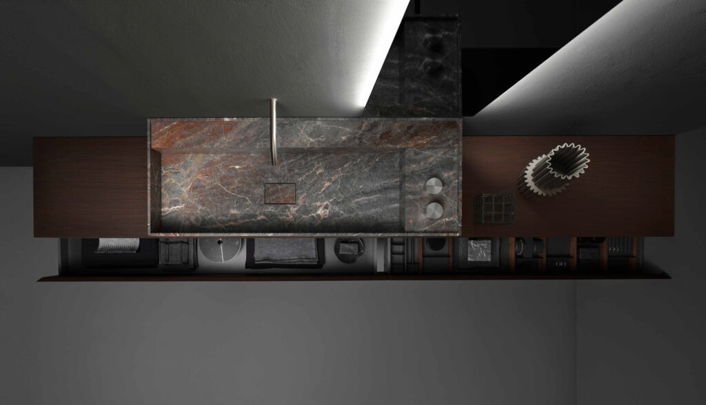 Il lavabo con larghezza 120cm viene proposto in dieci tipologie di marmo e in cemento, con una scelta tra undici colorazioni diverse.