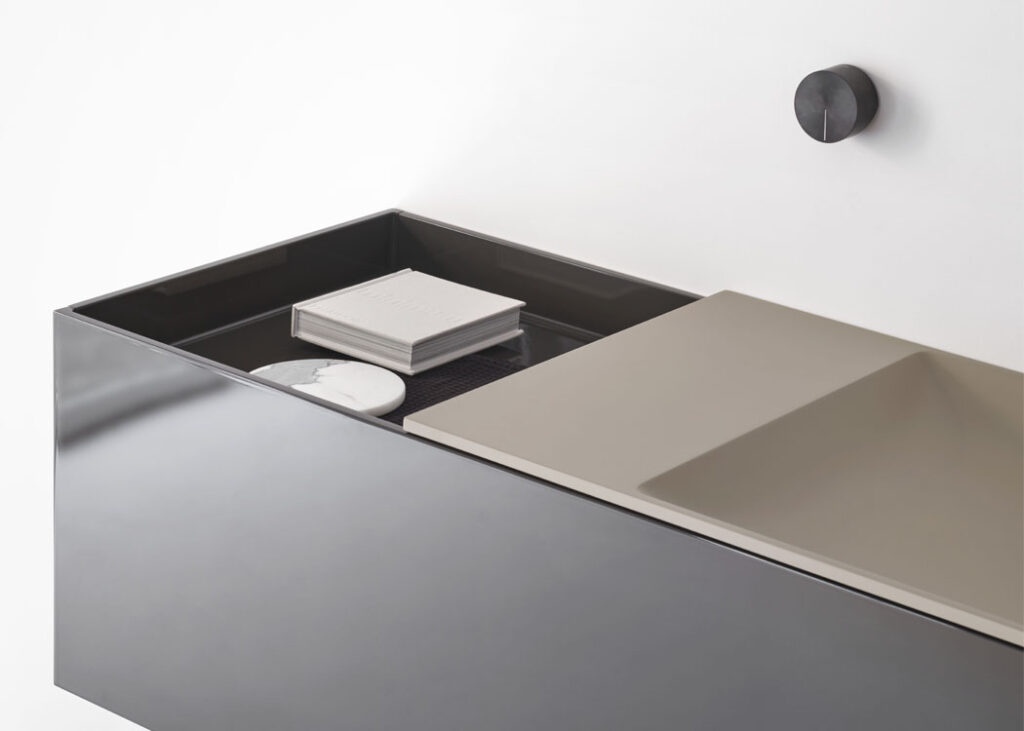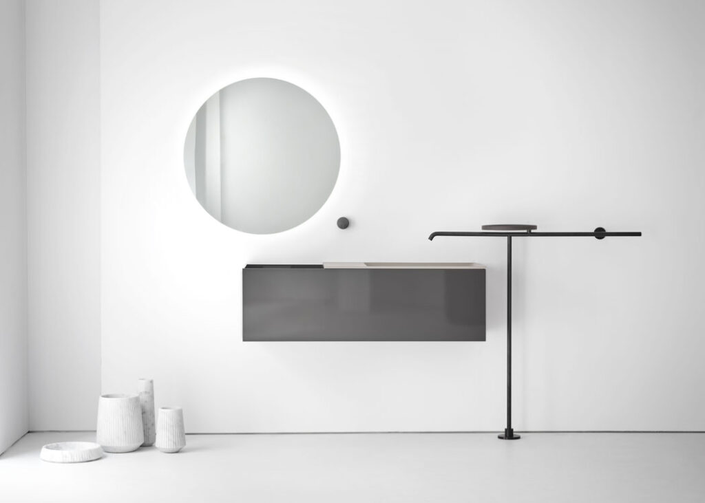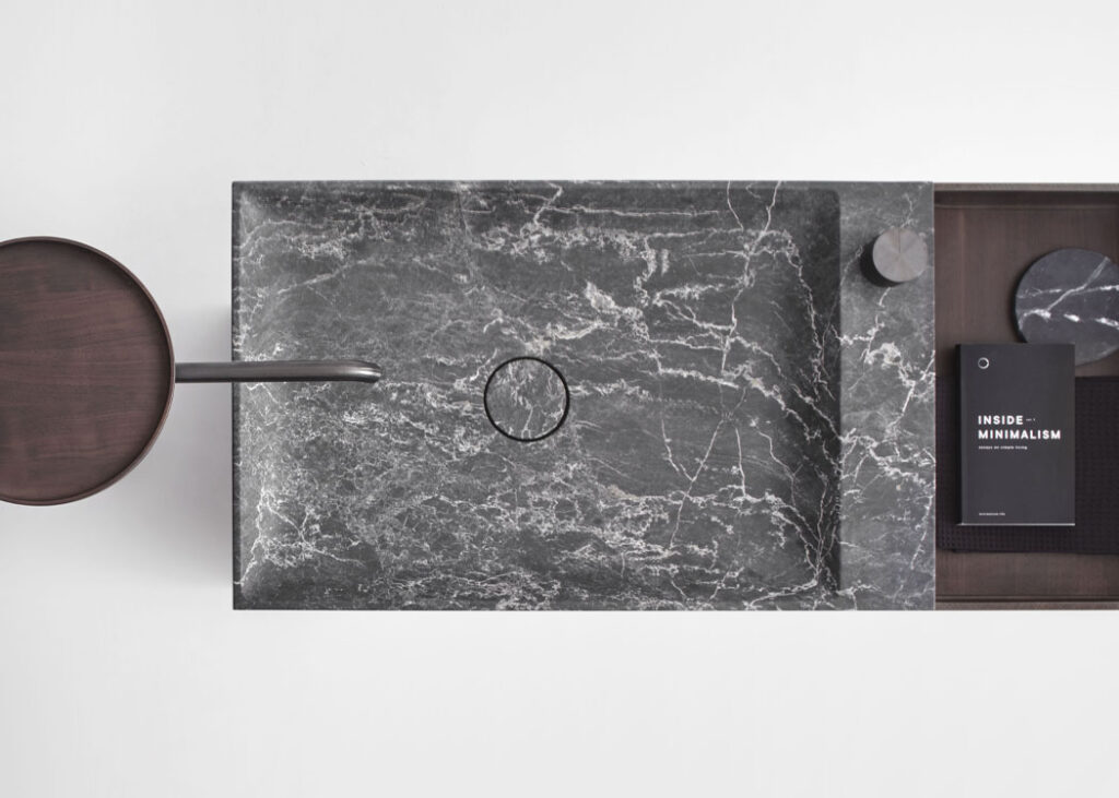 Un progetto che fonde design e architettura, linee minimaliste e ispirazione nipponica. Un sistema essenziale e sofisticato, composto da due elementi in equilibrio tra loro: il lavabo in marmo, integrato nel mobile contenitore in legno massello, e il sottile stelo di erogazione dell’acqua in acciaio inox. Un componente che funge, all’occorrenza, come supporto per uno specchio, per un vassoio porta oggetti, oppure per appendere gli asciugamani. Una struttura flessibile, dal design innovativo e raffinato, che si adatta ai diversi spazi abitativi.