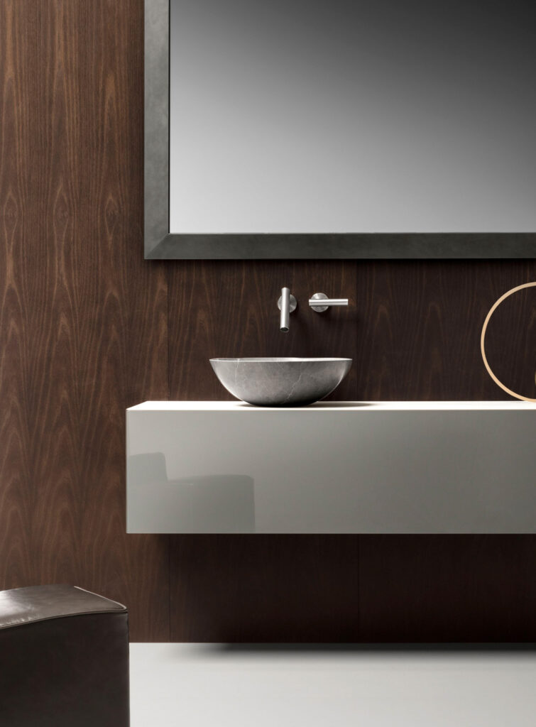 Le finiture laccate sono realizzate a mano su pannelli di MDF E1/Carb2, con vernici all’acqua, su fondo poliestere per ambienti umidi. Per le laccature lucide il processo prevede inoltre la laccatura diretta a più mani, procedimento che garantisce una uniforme, eccellente e duratura brillantezza.