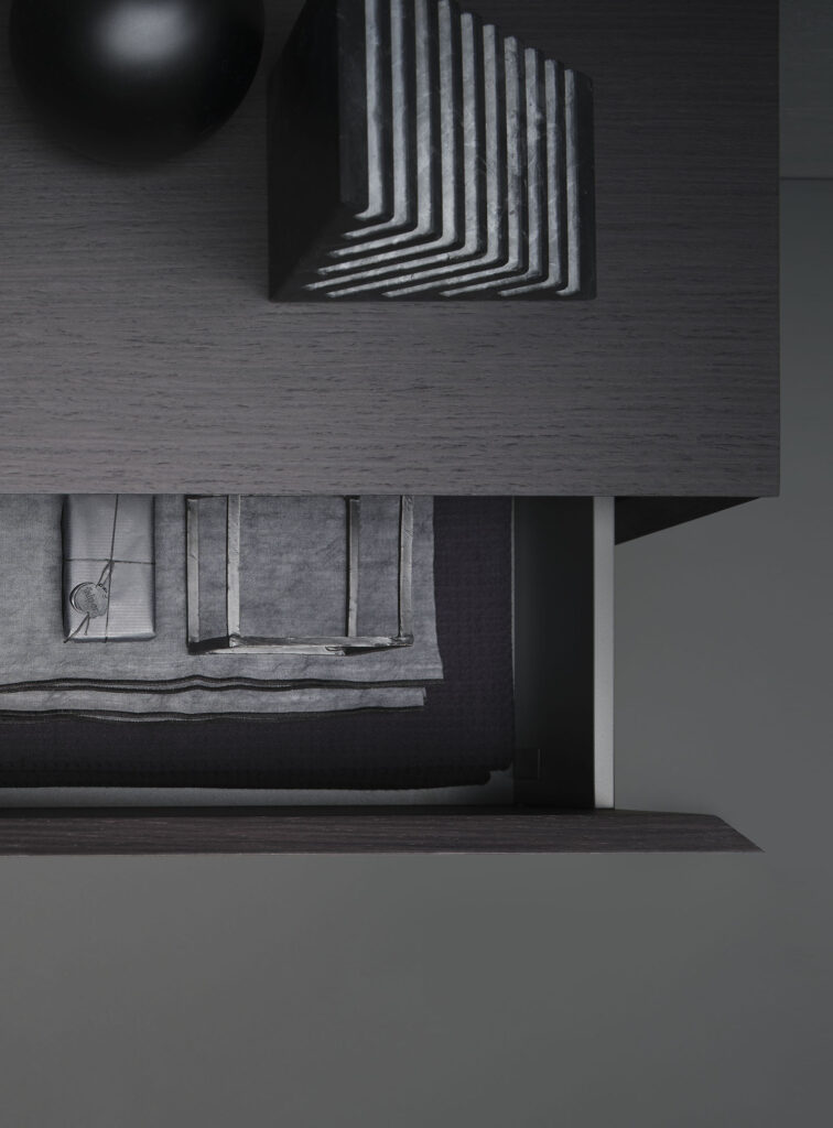 Le finiture legno sono realizzate con processo di verniciatura misto all’acqua, su pannelli in multistrato di betulla, impiallacciato in rovere e noce, con incollaggio AW 100 per ambienti umidi. Le bordature in essenza avvengono con colle poliuretaniche resistenti all’acqua. Tutti i pannelli sono classificati E1 e su richiesta CARB2 per la bassa emissione di formaldeide.